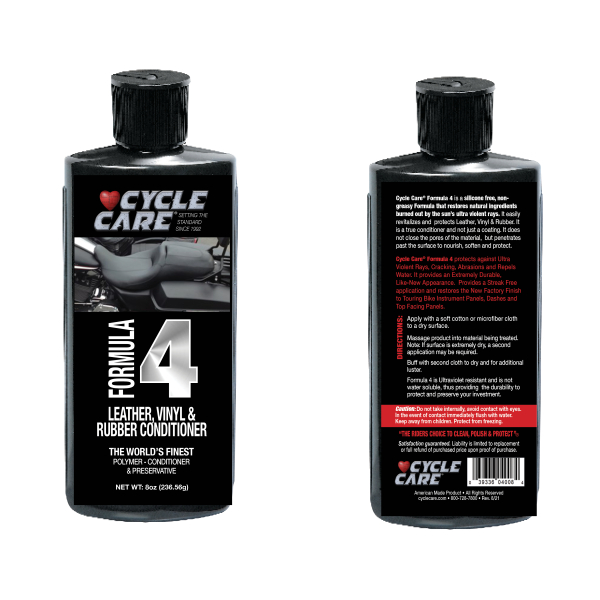 Cycle Care Formula 4, is a unique, pleasantly scented formulation of premium quality polymers designed to restore the luster and softness to vinyl, leather, and rubber surfaces. In addition, Cycle 4 protects against ultra-violet rays, cracking, repels water, and prolongs the life and like-new appearance of the materials. Applied to rubber, Cycle 4 creates a water repellent new appearance, helps prevent tire weather cracking and increases soil resistance. You may also use Cycle 4 to restore factory finish to touring bike instrument panel/dash and top facing panels.