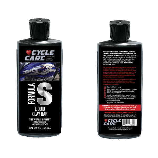 Cycle Care Formula S is a specialty product designed to safely repair blemished areas on clear coat surfaces. This product provides just the right amount of pumice blended with the correct amount of emulsifier to remove light scratches, scuffs, swirls, abrasions, water spots, tree sap & road tar. Formula S will repair clouded or oxidized clear coated or painted surfaces. This product effectively removes scratches, scuffs, swirls, and other problems without heavy grit found in automotive rubbing compounds. Formula S is not a protective polish. After use, remember to apply a good preservative product, such as Cycle Care Formula 3 Windshield, Paint & Chrome Polish.
